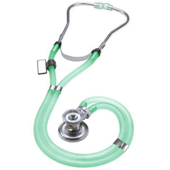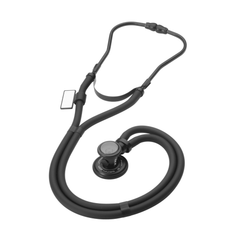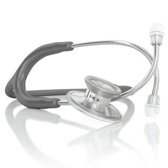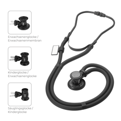 Um sicherzugehen, dass Sie mit der richtigen Seite des Bruststücks hören, können Sie auf die Membran klopfen, um den Ton zu prüfen, oder den grünen Punkt überprüfen. MDF Instruments® Stethoskope haben einen kleinen grünen Punkt auf dem Stiel des Bruststücks, der auf die Seite der Membran mit dem offenen Schallkanal zeigt. Um zwischen der Membran- und Glockenseite des Bruststücks zu wechseln, drehen Sie einfach den Stiel und er rastet ein.Verwenden Sie die Membranseite, um hohe Frequenzen zu hören, und die Glockenseite für tiefe Frequenzen. Wenn Sie immer noch Probleme mit dem Hören haben, vergewissern Sie sich, dass zwischen der Membran und dem Haltering kein Spalt vorhanden ist. Sie sollten wie bei einer Trommel dicht abschließen.